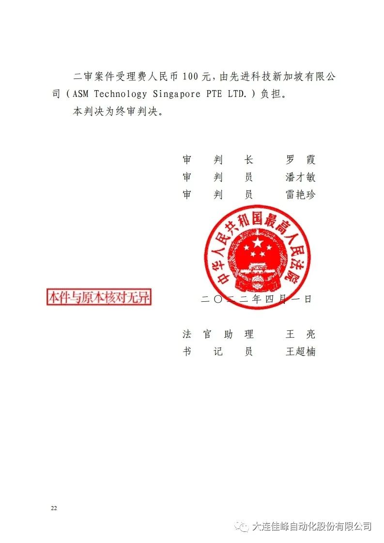 2021年3月,ASMPT向中华人民共和国最高人民法院提起二审诉讼,2022年4月13日,中华人民共和国最高人民法院下达了终审判决,认定ASMPT主张不成立,国家知识产权局和大连佳峰胜诉。