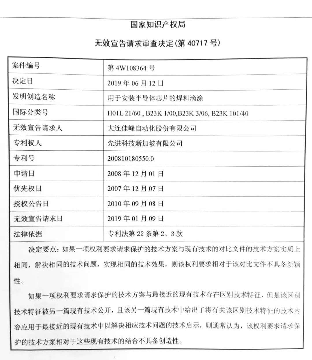 2019年6月26日,国家知识产权局对先进科技新加坡有限公司ZL200810180550.0发明专利,做出了无效宣告的审查决定。