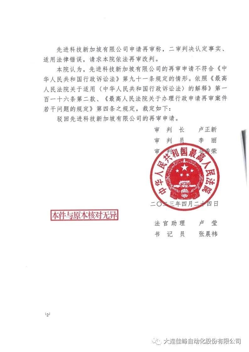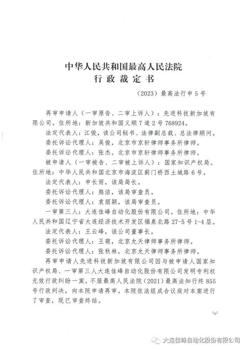 2023年2月,ASMPT向中华人民共和国最高人民法院提出再审。2023年4月24日,中华人民共和国最高人民法院下达了行政裁定书,驳回ASMPT的再审申请,国家知识产权局和大连佳峰终获胜诉。