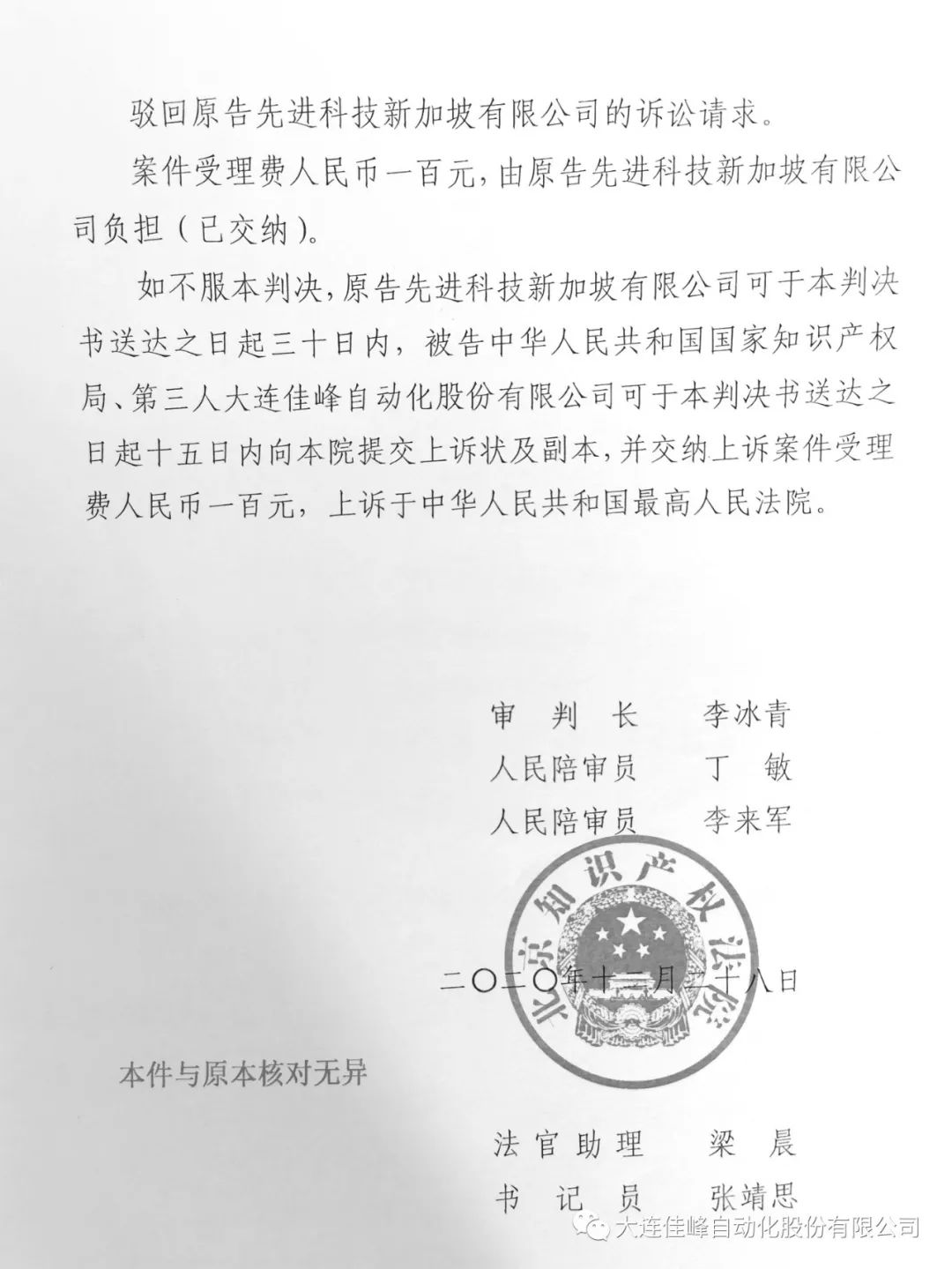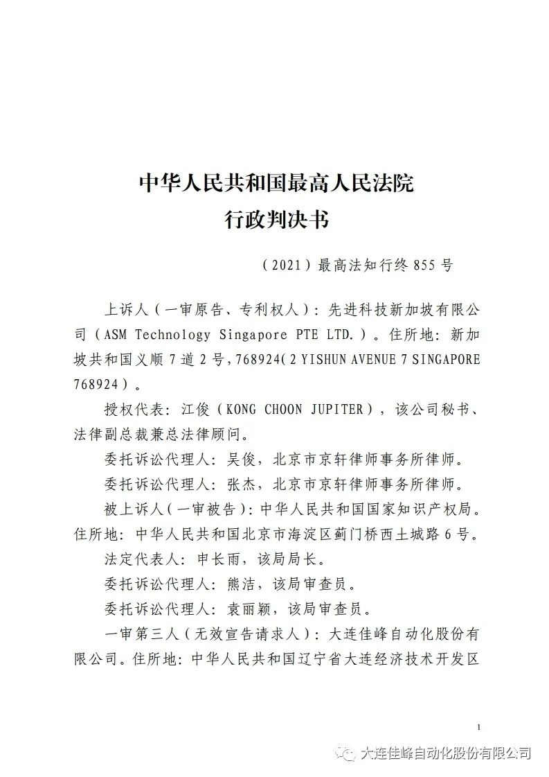 2020年2月,ASMPT不服国家知识产权局的审查决定。在北京知识产权法院提起行政诉讼,大连佳峰进行了举证。2020年12月,北京知识产权法院判决国家知识产权局和大连佳峰胜诉。