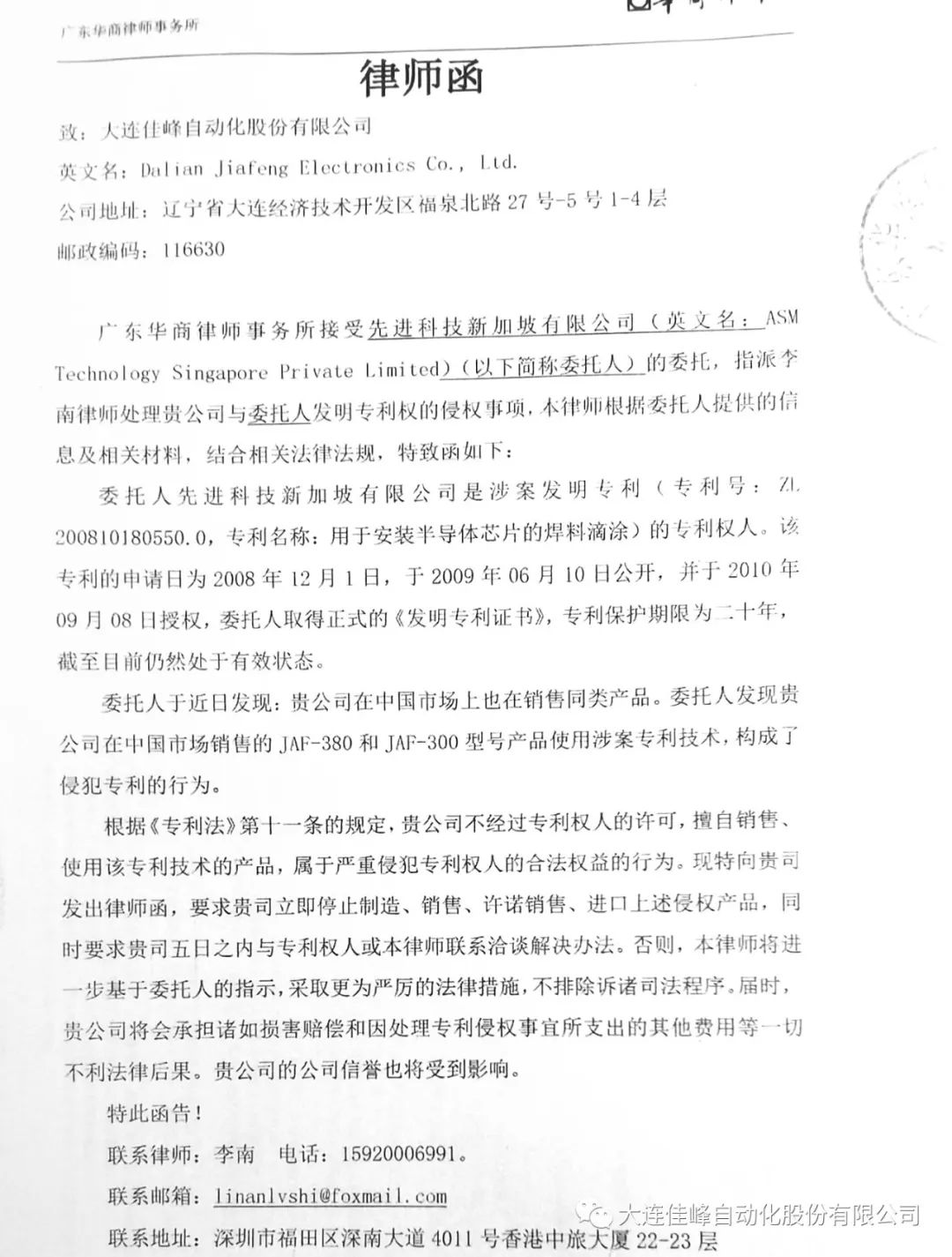 2018年大连佳峰收到ASMPT的律师函,称侵犯其发明专利(专利号:ZL200810180550.0),要求佳峰停止销售涉及该专利的产品。