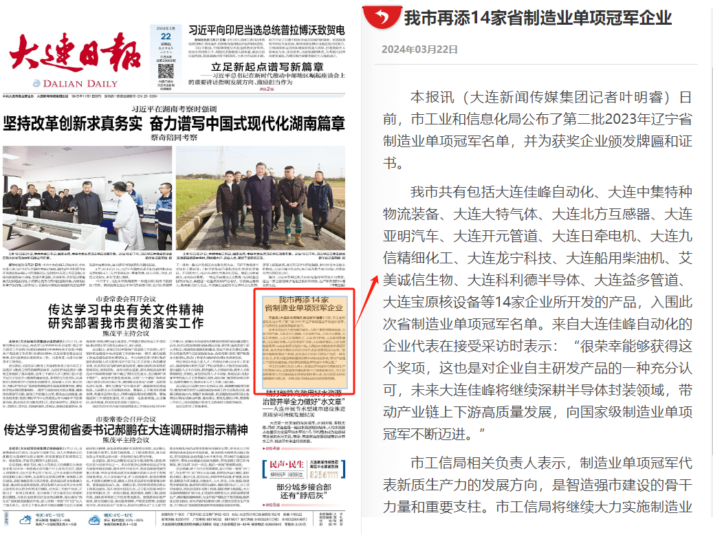我司以软焊料装片机申请,荣获了“辽宁省制造业单项冠军企业”奖项及荣誉。大连佳峰作为高尖技术企业,被大连电视台及大连日报都进行了报道及专访,未来大连佳峰将继续深耕半导体封装领域,带动产业链上下游高质量发展,向国家级制造业单项冠军不断迈进。